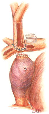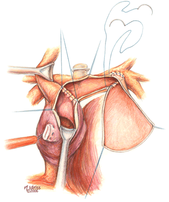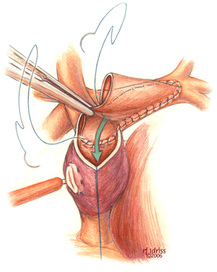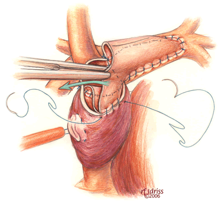 If a hemi-Fontan is performed (Figures 1-6), the venous cannula is removed. A right atriotomy is made beginning in the most superior portion of the atrium and extending onto the medial aspect of the SVC. The pulmonary artery confluence is incised anteriorly and the incision extended from a point medial to the right upper lobe branch leftward to a corresponding site on the left pulmonary artery. If there is antegrade flow across the pulmonary valve, the main pulmonary artery is transected and the valve over-sewn. The right SVC is joined to the right pulmonary artery in a side-to-side anastomosis. When a left SVC is present, it too is opened along its medial side, occluded at the cardiac end, and joined to the left pulmonary artery in a side-to-side anastomosis. A single patch of cryopreserved pulmonary artery homograft tissue is used to augment the branch pulmonary arteries anteriorly, to create a roof over the vena(e) cava(e)-to-pulmonary artery anastomosis(es), and to create a dam occluding flow from the right SVC into the ipsilateral atrium. Prior to creating the dam, the SVC-to-right atrium junction is enlarged to the caliber of the IVC. Following completion of all suture lines, the heart is filled with saline to displace air, the venous cannula replaced into the atrium, and cardiopulmonary bypass resumed.