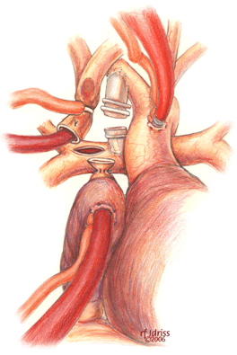 The patient is positioned supine and an arterial line is placed for sampling blood gases and measuring blood pressure. Central venous access is not routinely obtained to avoid the risk of venous thrombosis. Following endotracheal intubation, the ambient temperature is decreased, ice bags are placed on the head, and a cooling blanket is used to cool the patient. A median sternotomy is performed and initially the aorta and right atrium are exposed. Heparin is administered to achieve an ACT suitable for cardiopulmonary bypass followed by cannulation of the ascending aorta and placement of a single atrial cannula for systemic venous drainage. Extracorporeal flow is established at 150cc/kg/min, and all systemic-to-pulmonary artery shunts are occluded. The perfusate is then cooled to approximately 16o C. While the patient is gradually cooled to both nasopharyngeal and esophageal temperatures of 17° C, the remainder of the dissection is performed to expose adequate ascending aorta for cross clamping and to carefully free the SVC, pulmonary arteries and right atrium. Once the desired temperature is reached, the aorta is clamped, cardiopulmonary bypass flow is temporarily stopped, and cold cardioplegia solution is infused to achieve an electromechanical cardiac arrest. Alternatively, the superior cavopulmonary anastomosis may be performed using moderate hypothermia and continuous circulatory support.