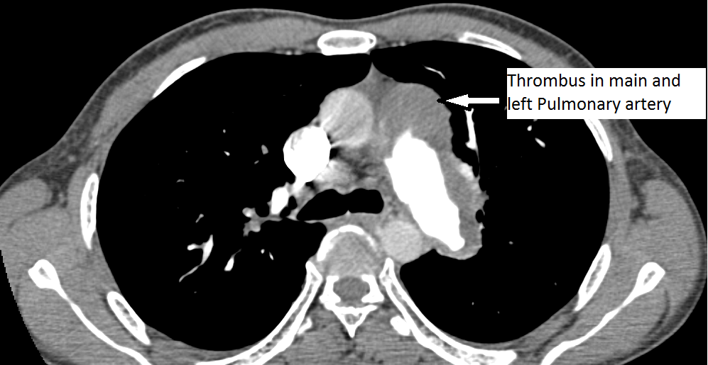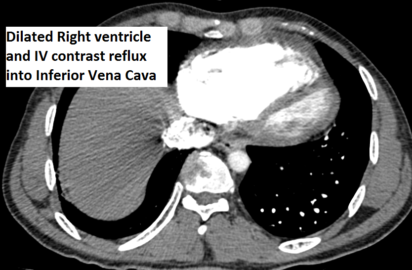 The authors present a case of CTEPH. The patient was a 35-year-old man presenting as an outpatient with complaints of severe progressive dyspnea. He was diagnosed with pulmonary embolism in the past and has been on anticoagulation for more than three years. He has had CT scans and chest x-rays in between. Multiple transthoracic echocardiograms have been performed with evidence of slowly declining right ventricular function. This time, he presented to the cardiac surgery service with a severely dilated and dysfunctional right ventricle. He had been on diuretics and vasodilator treatment but had mild to no improvement. After a thorough review, the authors decided to perform a pulmonary thromboembolectomy. The CT scan images show a dilated RV and intravenous contrast reflux in the inferior vena cava (Figures 1-4). The thrombus can be seen starting in the main pulmonary artery and almost completely occluding it. The thrombus extends into the bilateral pulmonary arteries.