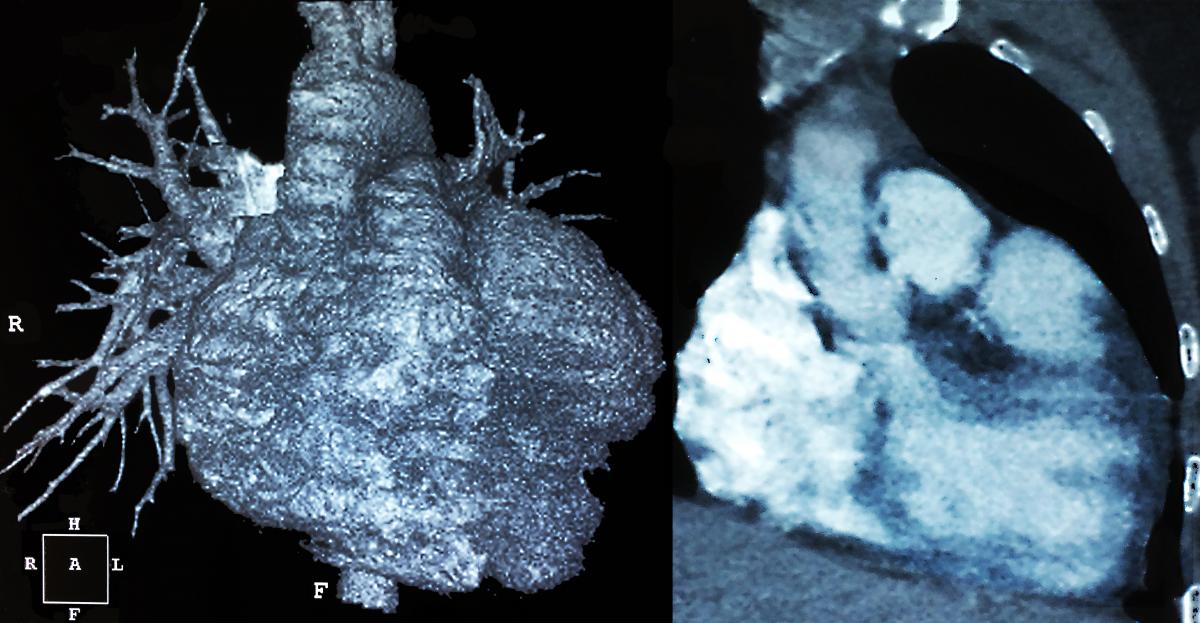 A 31-year-old female patient was hospitalized without any particular antecedent. She underwent a thoracic x-ray and left ventricular hypertrophy was found, despite no signs of clinical symptoms or an abnormal electrocardiogram. The echocardiography revealed a large 66 x 54 mm LAAA expanded and partially compressed to the left side of the left ventricle (LV). However, the LV ejection fraction was normal (66%) as long as the pulmonary artery pressure. Computed tomography (CT) was performed to precisely assess the dimension of the LAAA and the communication with the LV, as well as the condition of the pulmonary veins and other surrounding structures (Figure 1). The patient was scheduled to undergo surgery in 2017.
