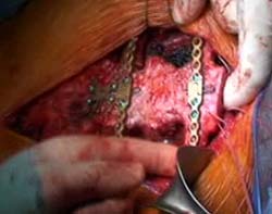 Neoplastic involvement of the sternum is a challenging situation. Surgical treatment is indicated in the case of controlled primary disease, absence of other metastases, and/or severe comorbidities limiting the patient’s life expectancy. Wide resection margins are needed for an effective operation, and reconstruction of the thoracic cage is important to ensure good postoperative respiratory function. In addition, the sternoclavicular junctions are involved in the normal mobility of the shoulder girdle and support of the axial skeleton. Transosseous hi-tension sutures were used to stabilize and reconstruct the continuity between the neo-sternum and the clavicles. The surgical technique of sternal excision and reconstruction with a sternal allograft and titanium bars and screws is a new option for treatment of neoplastic or infectious involvement of the sternum. Bone allografts have optimal biomechanical characteristics, are fully biocompatible, and carry a low risk of infection. Sternal allografts also act as a scaffold for osteoprogenitor cells and bone formation with good host tissue incorporation. The reported technique is simple and reproducible. This video gives details demonstrating the authors’ technique of sternal allograft implantation.