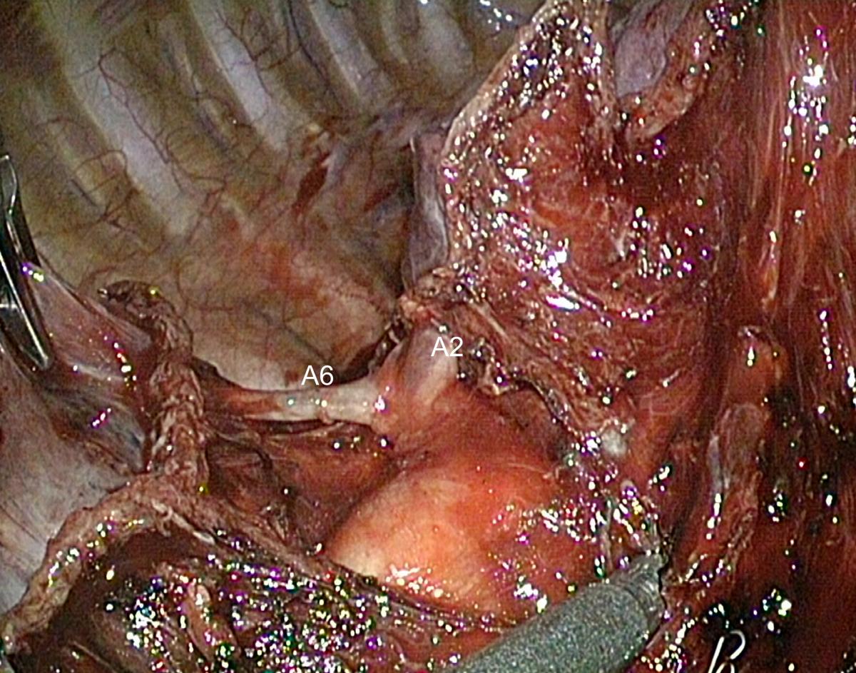 - Completing this approach with division of the fissure without dissection of pulmonary artery can lead to accidental tearing or stapling of an A6 artery when the latter has a common birth with A2 or even arises from A2.
