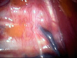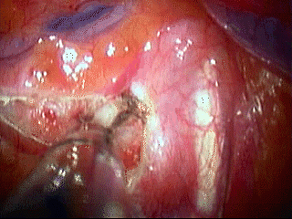 We perform bilateral synchronous sympathectomy starting on the right side. An L-shaped hook cautery alternating cutting/coagulation is used to divide the sympathetic chain as this is easier and quicker than attempting to remove a segment of the chain (Figures 2-4). Special care is taken to make sure that complete ablation of ganglia and severance of the sympathetic chain is achieved. We generally continue the dissection by cauterizing/dividing the pleura for 5 cm lateral to the chain. If an aberrant nerve bundle of Kuntz is identified, it too is severed. The transected ends of the sympathetic chain are separated as far as possible and cauterized to prevent regrowth of the nerve and recurrence of symptoms. For patients with hyperhidrosis, level T2 and T3 or T2-T5 are divided, depending on the severity of the lower extremity symptoms. Care should be taken not to divide the sympathetic chain above the level of the second rib for the treatment of palmar and plantar hyperhidrosis, because it increases the risk of Horner's syndrome and contributes little benefit. Thoracic outlet syndrome or reflex sympathetic dystrophy is usually approached at T1-T3. For chronic pancreatic pain, we usually divide the sympathetic chain at the level of T4 to T10. Before closing the skin, a small chest tube is left in the chest and the subcutaneous tissue is closed with 3-0 Vicryl. After expanding both the patient's lungs with positive pressure ventilation, the tube is removed from the chest quickly at positive pressure to avoid a residual pneumothorax, and then a final subcuticular suture is placed. Hence, no thoracic drain is needed postoperatively. The procedure is then repeated on the left side. A chest radiograph is immediately obtained after the operation in the operating room to ensure complete lung expansion. The operation is usually performed in an outpatient setting, and patients are discharged 6-8 hours after the operation.