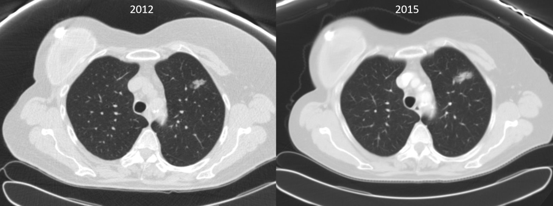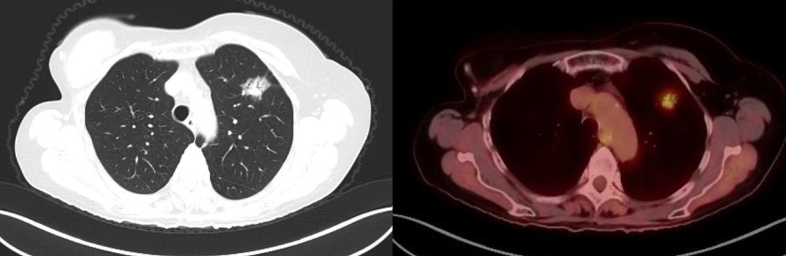 A 70-year-old woman with a past history of breast cancer in 2004 also had a nonperipheral pseudonodular ground glass appearance lesion in the left upper lobe since 2010, a core-needle biopsy in 2012 and 2015, and a diagnosis of benign pneumocytoma (Figure 1). Since 2018, the lesion had a growth of the solid component in chest computed tomography scan, so a positron emission tomography scan was performed, which showed an increased metabolic uptake in the lesion (SUV max 2.77) (Figure 2).