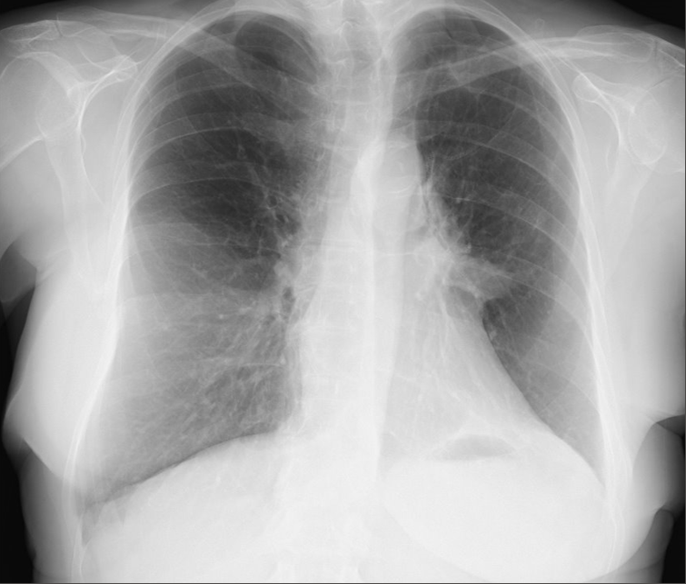 There was no postoperative air leak, and the chest tube was removed during the first postoperative day. The patient was discharged on the second postoperative day with normal chest x-ray (Figure 3). Final pathologic exam reported a 2.1 cm lepidic adenocarcinoma with free margins, and all the lymph nodes were negative for malignancy, so the final pathologic stage was pT1cN0-IA3.