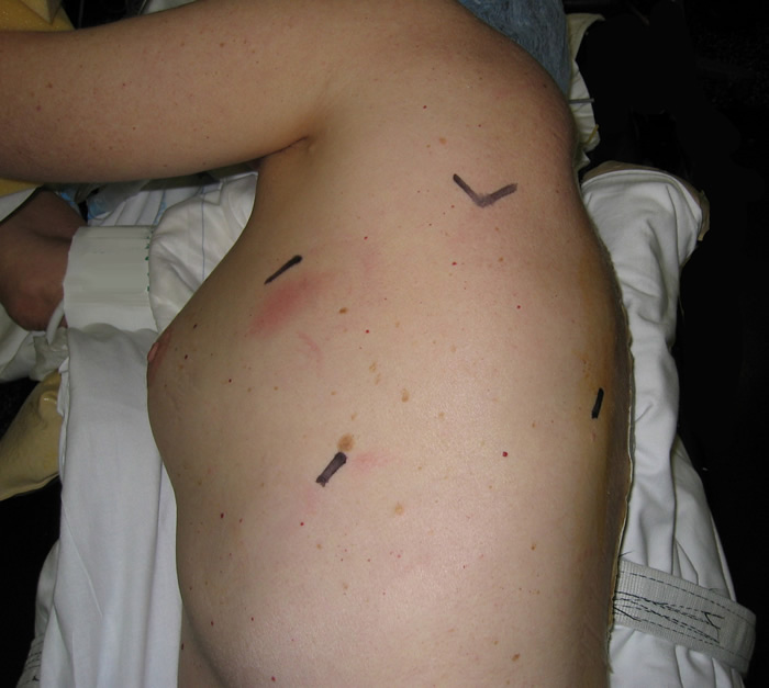 The patient is placed in the lateral decubitus position with the table break maximally-flexed at the patient’s hip level, and then reverse Trendelenburg tilts the table so the patient’s lateral chest wall is parallel to the floor. Figure 2 shows the patient in a suboptimal position where the hip would limit adequate visualization of the hemithorax by obstructing downward movement of the thoracoscope. Figures 3 and 4 demonstrate the same patient in the proper VATS lobe position. Single lung ventilation is established and the camera port is placed at the eighth interspace in the anterior axillary line for right-sided lesions and in the posterior axillary line for left-sided lesions. The posterior port is then placed where the lower lobe edge touches the diaphragm (approximately the 8th interspace). A lung clamp used as a retractor is placed through the posterior port and the upper lobe is retracted laterally to allow visualization of the superior pulmonary vein (Figure 5). The utility incision (no larger than 4 cm in length) is placed directly over the superior pulmonary vein for upper lobectomies (approximately the 3rd or 4th interspace, and one interspace lower for middle and lower lobectomies. A Weitlaner is used to retract the soft tissues; there is no need for rib spreading (Figure 6).
