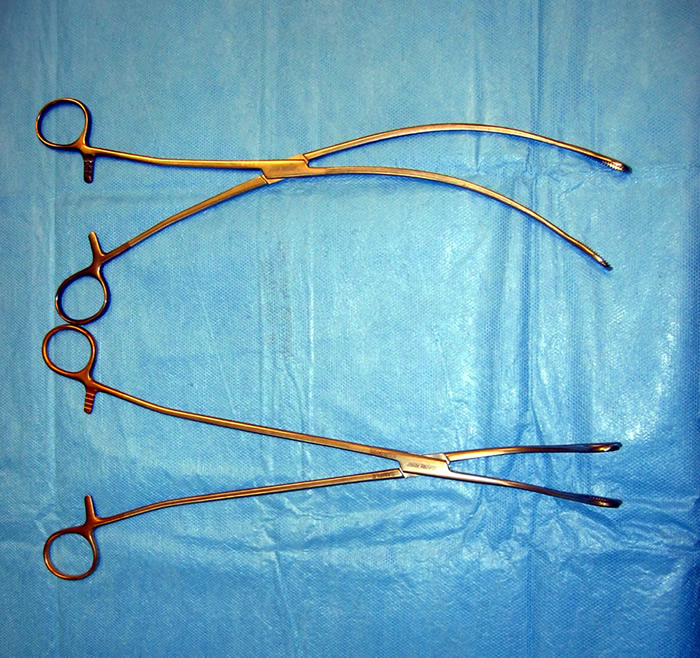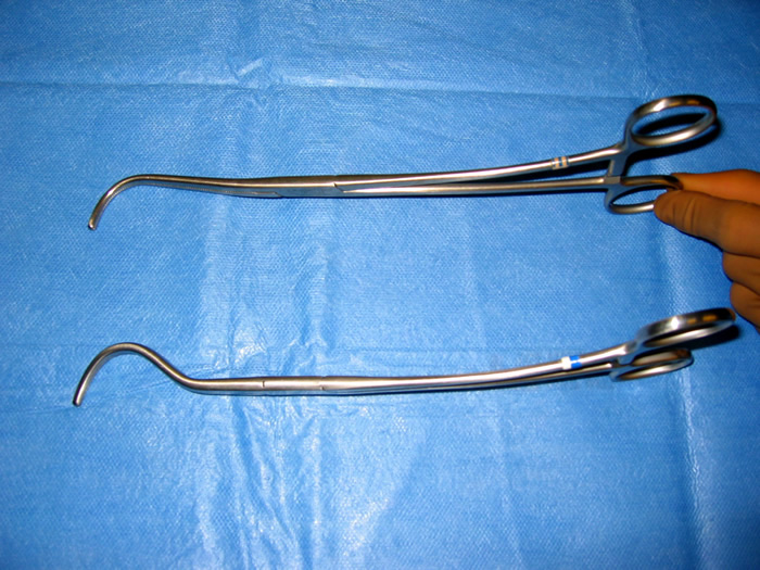 The superior pulmonary vein is dissected from the overlying pleura via the access incision in the same manner as in an open lobectomy. The perivascular tissue is placed on tension by forceps and standard scissors are used to cut and dissect the tissue in order to expose the superior and inferior aspects of the vein. A curved clamp (Figure 7) is passed behind the superior pulmonary vein after clear identification of the middle lobe vein. The superior pulmonary vein is encircled with a monofilament tie and retracted upwardly via the utility incision. A ring forceps (Figure 8) is placed through the utility incision and is used to retract the upper lobe posteriorly. A vascular (2.5 mm staple height) linear cutting stapling device is placed through the posterior port and, using the monofilament suture as a guide, is passed behind the superior pulmonary vein, and is fired. Once the pulmonary vein has been divided, the truncus arteriosus is easily visualized. Dissection is performed by placing tension on the perivascular tissue with a forceps and incising the tissue with a scissors until the entire arterial branch can be seen from its origin from the main pulmonary artery. The arterial dissection is facilitated if the level 10R lymph nodes are removed first. Once the entire artery is visualized, a curved clamp is passed and a monofilament suture is placed behind the artery and brought through the utility incision. The vascular stapler is passed though the posterior port to transect the vessel. Transection of the truncus artery branch exposes the right upper lobe bronchus. A scissors is used to sharply incise the peribronchial tissue and a blunt pushing motion with closed scissors helps to develop a plane between the interlobar pulmonary artery and the bronchus. Once the interlobar artery is safely pushed away from