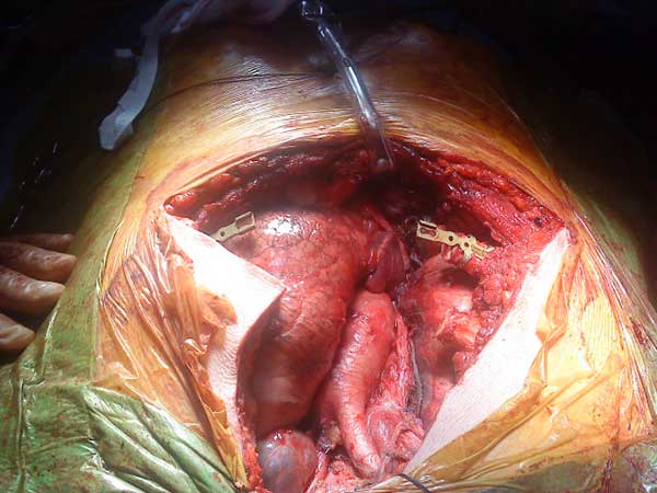 - Two chest drains are put in the pleural cavity and a drain is also placed at the end of the reconstruction. Plastic surgical reconstruction over this repair can then proceed.