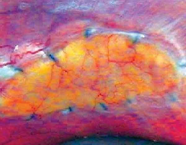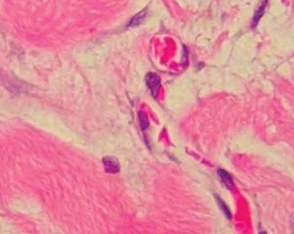 The use of a flexible patch sutured over the framework of titanium bars is often needed to provide a base for overlying soft tissue reconstruction, and to tissue prevent herniation between the bars. Large synthetic polymer patches are an infection risk. Veritas® pericardium is acellular, biocompatible with an extremely low level of extractable DNA, and has been used in closing large fascia defects in abdominal wall and breast surgical practices, particularly in the presence of established infection. It is clearly a new product for which there is so far limited clinical data, but the early experience at these sites suggests it provides good fascial support to surrounding autologous tissue and resists infections. The Veritas® Collagen Matrix fosters remodeling by supporting both angiogenesis and cellular ingrowth. (Figures 2,3) Angiogenesis within the implant establishes new capillaries, thereby making the implant environment hospitable. Fibroblasts within use the implant as a framework or “scaffold” for deposition of new collagen cells. The remodeling stage progresses within the patch with continued deposition of cells and reorganization of the new synthesized collagen and blood vessels. The result is the seamless integration of the implant into the surrounding tissue. Animal studies demonstrate that after as little as one month, the implant is histologically indistinguishable from the host's native tissue.