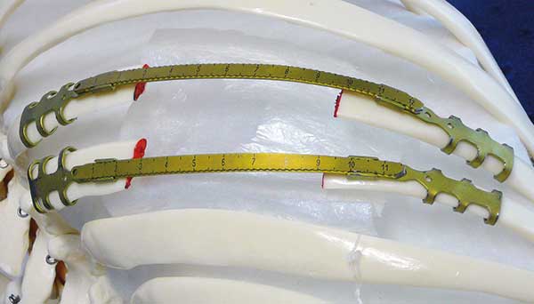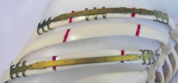 - Each rib defect is, subsequently, replaced with a titanium rib bridge. (Figure 15) The connecting bar is then cut to size using carbide-tipped pliers and is hand-contoured to the shape of the chest wall. Finally, the bar is crimped onto the clips. (Figure 16)