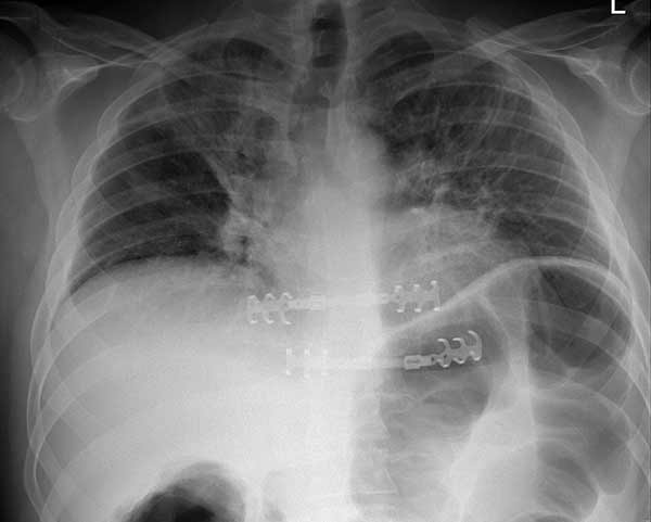 | Figure 4: Model showing application in chest wall resection. | Figure 5: Postoperative chest x-ray showing the implants |