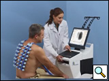 Figure 1: A PC-controlled, low vacuum system maintains constant and simultaneous attachment of 40 active piezoelectric contact sensors and 2 inactive contact sensors (left and right peripheries of the first row) to the posterior chest.