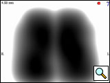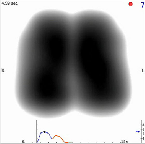 The recording process is quick, requires minimal patient effort, and is appropriate for the pediatric population as well as the adult population. Patients are seated in a quiet environment and are recorded during 12 seconds of deep breathing without forced exhalations. Lung sound signals are transferred to a computer and are analyzed by the VRI software. The signals are processed by band-pass filtering with different frequency ranges: 100-250Hz for capturing breath sounds while filtering heart sounds and chest-wall movement [4, 9], 350-850Hz for crackles, and 100-2,000Hz for wheezes. The filtered signals are then combined and sliced over regular time intervals (0.17 sec) and converted to a sequence of dynamic images that reflect regional vibration properties along time. The computer measures the maximum vibration energy during inspiration (this frame is referred to as the maximal energy frame) and uses this value for normalization of the image (Figure 2). Accordingly, the lung vibration energy will be depicted as various shades within the 256 hues from black in high data areas to white in the minimum data area.