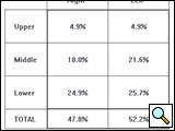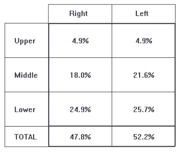 Figure 3: Quantitative assessment of breath sound distribution in the same healthy subject depicted in Figure 2, shown as a table of percentages. Vibration energy is concentrated primarily in the middle and lower regions with less energy in the upper lung fields.
