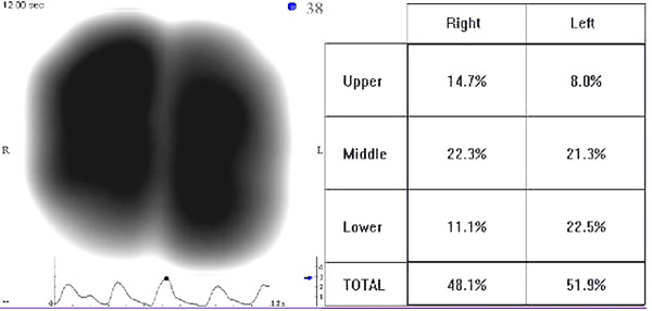 Figure 5B: Following balloon dilation and laser incision, the VRI shows an increase in vibration energy to the right lung (48% of the total energy) and a nearly normal distribution pattern.