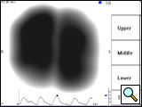 The resulting sound or vibration energy can also be analyzed regionally for upper (top 2 rows of sensors), middle (3 rows of sensors), and lower zones (bottom 2 rows of sensors) for both the right and left lung and presented in a table (Figure 3). Presumably, both the regional quantification of breath sounds and the dynamic image are affected by changes in frequency, intensity, space, and timing of airflow and, therefore, can provide useful clinical information regarding lung condition.