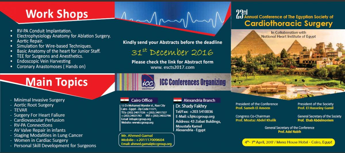 This is the most comprehensive and valuable cardiothoracic congress in our region that will be held in the great city of Cairo, capital of Egypt, the land of all civilizations during the period of 4-6 April 2017.