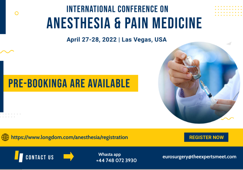 Longdom Conferences extends our immense pleasure and honor to invite you to attend the "International Conference on Anesthhesia and Pain Medicine" scheduled on April 27-28, 2022 in Las Vegas, USA. It is focusing on the theme “Latest Advancements in Anesthesia and Pain Medicine" to enhance and explore knowledge among academics and industry personnel dealing with Anesthesia and its related topics to establish corporations and exchanging ideas and it aims to provide the right stage to present stimulating Keynote Talks, Plenary Sessions, Poster Presentation, Young Researchers Forum, Video Presentations by Longdom Conferences.