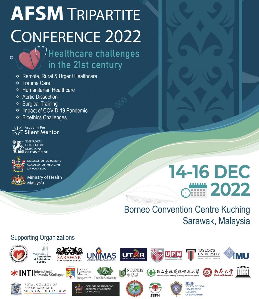 The Royal College of Surgeons of Edinburgh (RCS Ed) - Malaysian Association for Thoracic and Cardiovascular Surgery (MATCVS), and the Academy for Silent Mentor (AFSM) are organising an Aortic Dissection Symposium from 14-15 December 2022 at the Borneo Convention Centre in Kuching, Sarawak, Malaysia. There will also be a pre-congress Aortic Root and Aortic Arch Surgery Cadaveric Workshop on 13 December 2022. These are being held as part of the AFSM Tripartite Conference on Healthcare Challenges in the 21st Century.