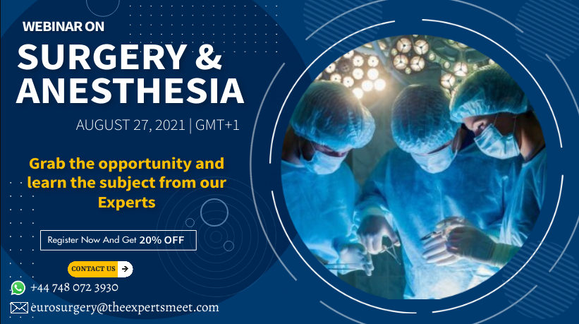 Webinar on Surgery and Anesthesia will be hosted on August 27, 2021 as per UK Time Zone (GMT+1). Panel of speakers will be delivering their presentations on their recent research related to Surgery and Anesthesia. The current state of knowledge, its impact on the future will be discussed in detailed. Longdom Conferences invites all experts to be part of this webinar series and make it a perfect platform for knowledge sharing and networking.