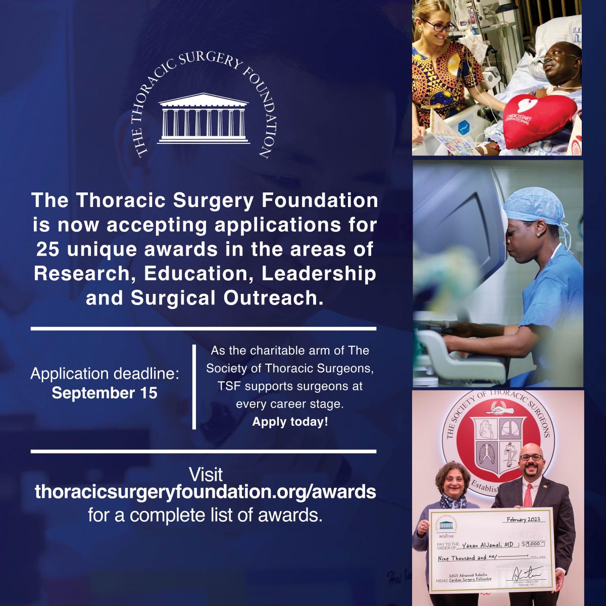 Applications are now being accepted for the 2024 Thoracic Surgery Foundation (TSF) awards in the areas of cardiothoracic surgery research, education, leadership, and surgical outreach. Visit the TSF website to view eligibility criteria and apply for funding. The deadline for most awards is September 15, 2023.