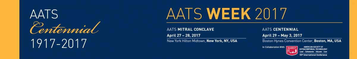AATS Week 2017 includes three premier events: The AATS Mitral Conclave (April 27-28, 2017, New York, NY), the AATS Innovation Summit (April 29, 2017, Boston, MA) and the AATS Centennial (April 29-May 3, 2017, Boston, MA).