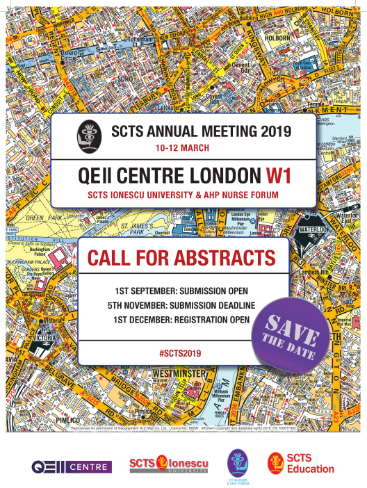 The Society for Cardiothoracic Surgery in Great Britain and Ireland invites you to submit abstracts for the SCTS Annual Meeting on March 10-12, 2019, at the Queen Elizabeth Conference Centre in London, UK. The meeting includes SCTS Ionescu University and AHP Nurse Forum. The submission deadline is November 5, 2018, and meeting registration opens on December 1, 2018.