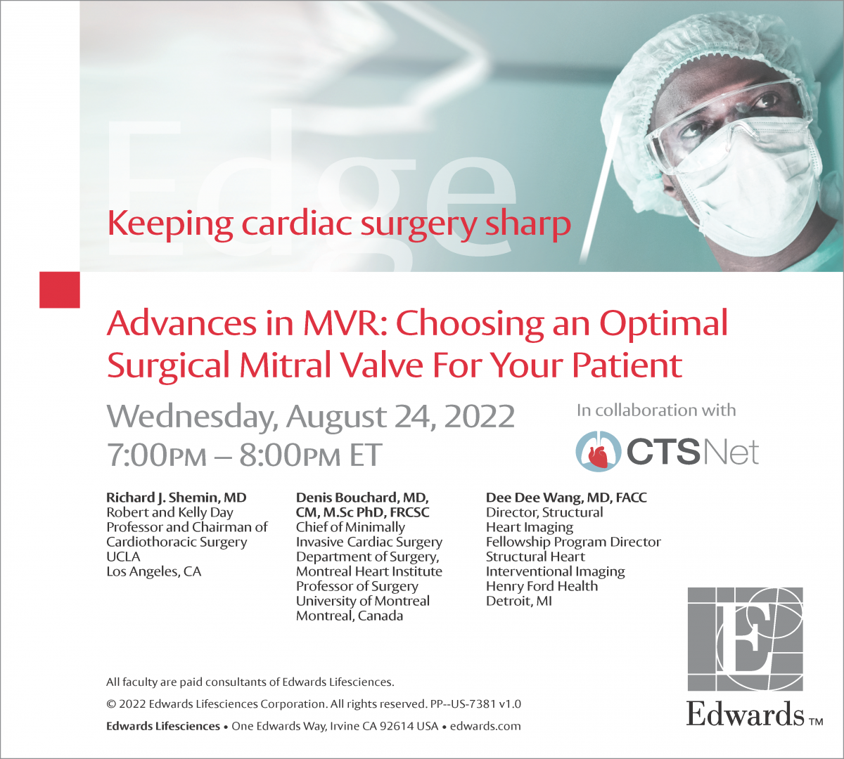 On Wednesday, August 24, at 7:00 p.m. ET(US), Edwards Lifesciences in collaboration with CTSNet will present a live webinar “Advances in MVR: Choosing an Optimal Surgical Mitral Valve For Your Patient.”