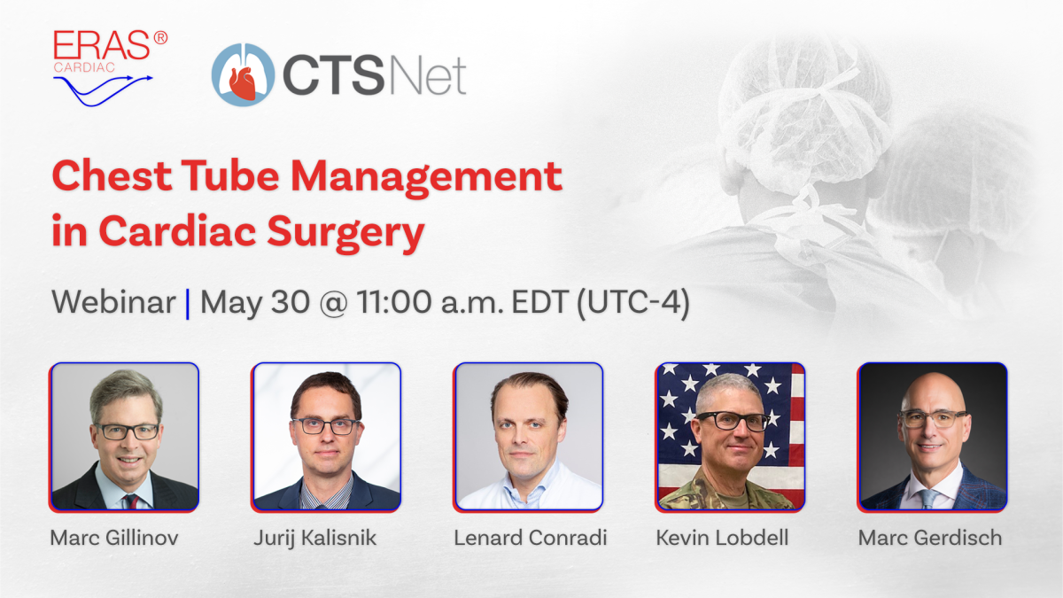 The Enhanced Recovery After Surgery (ERAS) Cardiac Society and CTSNet will be holding a webinar on the cardiac topic, “Chest Tube Management in Cardiac Surgery.” The webinar will take place on May 30, 2024, from 11:00 a.m.–12:00 p.m. EDT (UTC-4). A recording of the webinar will be made available on CTSNet the following week. Registrants unable to attend live will be notified of the recording’s availability, so be sure to register!