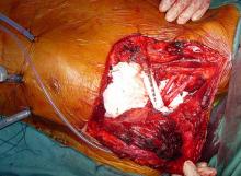 Surgery was performed with curative intent. The patient was positioned supine with the neck fully extended and the head turned away from the tumor. The tumor was approached through the anterior trans-cervical approach described by Dartevelle. This approach allowed us to dissect the subclavian vascular bundle and the nerve roots of the brachial plexus freely, quickly and safely without sacrificing the radical intent of the operation. After assessing the extent of the tumor from inside and outside of the chest, the lateral arches of the first, second and third ribs were cut and removed en-bloc with the surgical specimen (Figure 2). Due to the high risk of de-stabilizing the shoulder girdle after resection of the first three ribs, clavicle division and muscle resection, we reconstructed the chest wall and clavicle using the Stratos™ titanium bars and clips (Strasbourg Thoracic Osteosyntheses System; MedXpert, Heitersheim, Germany) (Figure 3). The chest wall defect and the reconstructed clavicle were covered with polytetrafluoroethylene (PTFE) patches (Figure 4).