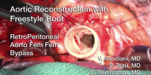 A third incision was then made into the aortic root by opening both groins and passing fingers, then the instruments up the side of the femoral artery past the kidneys. Using a finger in the left chest down the aorta, a 7 mm Dacron graft was passed retroperitoneally and sutured from the aortic freestyle root to the femoral artery. Then, a second femoral-femoral graft was used to revascularize the patient’s legs.