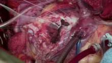 In the process of lead dissection, a collection of caseous fluid was encountered and sent for culture. The right ventricular lead fibrosis was obstructing the tricuspid valve orifice area, leading to functional stenosis. Also, the valve was not repairable; therefore, a bioprosthetic valve was implanted in standard fashion. Given the extensive debridement required, a bovine pericardial patch augmentation of the right atrium was required to ensure unobstructed flow from both vena cavae into the atrium and across the tricuspid valve. New epicardial pacing leads were placed on the right atrium and right ventricle and tunneled to an infraclavicular pocket.