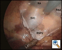 | Figure 3: Right-sided port view, showing superior vena cava (SVC), right superior pulmonary vein (RSPV) and right atrium (RA). Dissection begins posterior to SVC and medial to RSPV. |