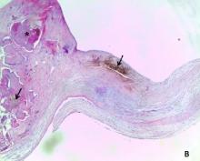 Figure 2 - A: Macroscopic aspect of the excised aortic valve. B, C: Histopathological features (light microscopy). B - Deformed aortic valve leaflet with abundant deposits of ochre-colored homogentisic pigment (arrow) and calcifications (*) [H/E x40]. C - High magnification of one pigmented (arrow) area and the underlying collagen (») [H/E x400].