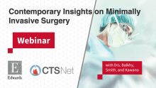 CTSNet is pleased to present the webinar recording of "Contemporary Insights on Minimally Invasive Surgery," featuring panelists Dr. Husam H. Balkhy [3] (University of Chicago), Dr. Robert L. Smith [4] (Baylor Scott & White), and Dr. Yuji Kawano (MedStar Washington Hospital Center). This webinar was hosted on April 10, 2024 by CTSNet in collaboration with Edwards Lifesciences.