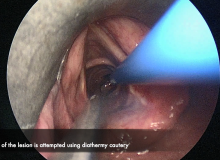 Under direct laryngoscopy, a 0 degree thoracoscope was passed into the trachea. A large, smooth lesion was seen in the distal trachea, occupying the majority of the tracheal lumen. The lesion was separated from the tracheal wall using low energy cautery. Upon dissection, the lesion ruptured and mucous material was released. Diathermy cautery dissection was continued to remove the cystic lesion and was removed in its entirety. Bleeding was controlled with a combination of diathermy. Endobronchial suction was used to clear the airways.