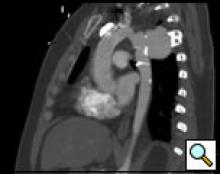 The patient is a 33 year old male with a history of juxtaductal coarctation who underwent a repair early in infancy. The patient had a recurrence of the coarctation and underwent a second open repair and left diaphragm plication at 2 years of age. He was lost to follow-up until recently when he presented to an emergency room with a several week history of hemoptysis and left back pain. The patient’s physical exam was remarkable only for a well-healed left thoracotomy incision. The patient was afebrile with equal blood pressures in all 4 extremities. The patient’s white count was normal. A CT scan of the chest demonstrated a saccular aneurysm of the proximal descending thoracic aorta measuring approximately 6cm in diameter (Figure 1). The patient was transferred to the Oregon Health and Sciences University for further management.