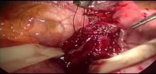 Next, the anterior gastroesophageal fat pad was carefully removed. The authors reflected the fundus of the stomach upward to perform the two-tier Belsey-Mark IV fundoplication, using double-armed 2-0 silk sutures with three sutures on each tier. The second tier sutures were brought out under the diaphragm and tied on the thoracic side.