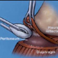 Thoracoscopy has become the diagnostic procedure of choice with a yield of > 90% for MPM. Talc pleurodesis (aerosolized 5 gm) is usually performed at the time of the thoracoscopic pleural biopsy to prevent reaccumlation of a symptomatic pleural effusion. The talc pleurodesis facilitates extrapleural dissection at the time of EPP and may also prevent intraoperative spillage of malignant cells that may increase the risk of local recurrence. A single thoracoscopic access incision (Figure 4) is usually placed either in the 5th or the 8th intercostal space. The 8th intercostal access incision is preferred because it can be incorporated into a utility thoracotomy incision if necessary at the time of EPP to facilitate resection and reconstruction of the diaphragm. To take full advantage of the extrapleural edema created by the talc, I have found that it is best to proceed with the EPP within 2 to 3 weeks after pleurodesis. This also allows time to complete the staging work-up and to finalize the tissue diagnosis.