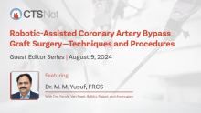 To wrap up the CTSNet Guest Editor Series, "Robotic-Assisted Coronary Artery Bypass Graft Surgery—Techniques and Procedures [3]," Guest Editor Dr. M. M. Yusuf was joined by his colleagues to discuss each video and their details in an open webinar panel. The webinar was broadcasted to a live audience on August 9, 2024. Dr. Yusuf served as the moderator and allowed his colleagues to share their insights and provide details on each of their contributed videos/presentations.