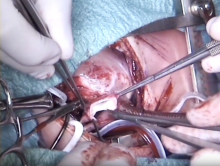 The surgery was scheduled for the following morning. The heart was approached through a median sternotomy. Prior to the connection to the heart-lung machine, the authors fully mobilized the great arteries and pulmonary branches. Before commencing the cardiopulmonary bypass, a tourniquet was applied to the anomalous pulmonary artery in order to prevent pulmonary overflow and organ malperfusion during the bypass. Prior to emptying the heart, the authors placed a marking suture in the future anastomotic site (on the lateral aspect of the main pulmonary artery). The bypass was established under mild hypothermia and cardiac arrest using a single venous cannula.
