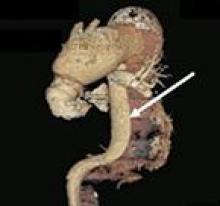 Figure 3: 3-D reconstruction of the thoracoabdominal aorta with the true lumen (arrow) and the chronic dissection.