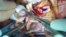 Once the autograft was excised, the annulus of the pulmonary autograft was measured using a Hegar dilator to choose a Dacron graft 3 to 4 mm larger than the pulmonary autograft. In this case, a 30 mm Dacron graft with the sinus of Valsalva was used, based on the size of the pulmonic autograft (26 mm). The autograft was then attached to the Dacron graft at the annular level with three pairs of running 5–0 polypropylene sutures, with each suture starting from the commissure and tied at the nadir of the valve. This facilitated hemostasis and ensured symmetrical implantation during the proximal anastomosis (Dr. Starnes used a mattress suture to secure this muscle skirt). At the distal end of the autograft, three 5-0 buttress stitches were placed at each of the commissures to make it symmetrical. A separate running 4-0 polypropylene suture was used to secure the distal end above the commissure level (Dr. Starnes used a single-running suture). The surgeons then anastomosed this composite autograft to the aortic annulus with 3-0 polypropylene sutures taken through the graft and muscle skirt, completing the left ventricular outflow tract reconstruction. Three pairs of 3-0 stitches were used starting from the right and left commissure (Dr. Starnes used a single-running polypropylene suture). In case of displacement of the left coronary button, the orientation of the composite autograft needs to be adjusted, as learned from Dr. Starnes. For example, if the left coronary button rotate was malrotated to the left and noncommissure, the composite autograft could be rotated counterclockwise to accommodate the location of the left coronary button. The valve was then tested for competence.