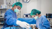 A 5 cm x 8 cm bovine pericardial patch was brought into the field and trimmed as necessary. The patch was sutured to the base of the left ventricle with a continuous 3-0 polypropylene suture, starting at the ventricle close to the mitral valve. It is important to sew the patch to the noninfarcted myocardium (yellow dots). After parachuting the patch, a separate suture was used to tighten the suture, and the patch was sutured to the endocardium of the healthy septum toward the apex, placed in an onlay fashion. The opposite side of the patch was then secured to the free wall of the left ventricle using a separate 3-0 polypropylene suture, which was initiated at the apex.