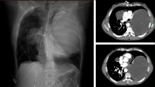 The patient is a forty-five-year-old man with metastatic testicular cancer, who underwent four cycles of chemotherapy with a complete response. Surveillance imaging revealed a 21 x 15 x 12-centimeter mass in the left chest and an 8-centimeter mass in the right upper lobe, consistent with metastasis.