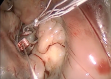 Mitral valve repair is the gold standard treatment for degenerative mitral valve (MV) regurgitation, and minimally invasive access allows for excellent exposure of the MV and subvalvular apparatus while minimizing surgical trauma. The use of polytetrafluoroethylene neochordae for replacement of ruptured chordae tendineae was introduced over twenty years ago (1). The so-called loop technique with the use of premeasured and premade neochordae especially facilitates minimal invasive MV repair (2). Depending on the commercially available product, a set of three or four loops is fixed to the respective papillary muscle head. Each loop is then sewed on to the prolapsing segment of the mitral valve around 8-10 mm off the free edge. The complete prolapsing segment is resuspended with neochordae. In order to complete the repair, an annuloplasty ring is placed in a standard fashion. In summary, the loop technique enables a straightforward MV repair with an excellent outcome, including normal leaflet mobility and a large MV orifice area (3).