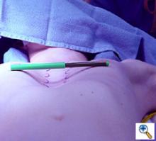 | Figure 2. A sterile marking pen marks the skin at the interspaces of maximal pectus depth on each side of the sternum. In this example, the pectus depth measures 4.5 cm. |