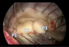 In the first procedure shown, the authors consider a patient with prolapse of the P2 and P3 scallops. Three-dimensional echocardiography confirmed the extension of the prolapse of these two segments. An endoscopic HeartPort technique was employed with endoclamping of the ascending aorta. Hydrostatic tests confirmed the mechanism of regurgitation being extensive prolapse and tissue excess of two scallops of the posterior leaflet. An anatomical requirement for the performance of the posterior leaflet remodeling technique is the presence of at least one normal scallop in terms of height and morphology; in the case shown, this was P1.