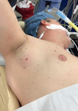 Once the wall of the lymphangioma was bluntly dissected under camera guidance, the cyst was entered with the port and the majority of its contents were aspirated. Insufflation was then used to create the working space for the dissection. The authors planned the trajectory of the ports and view to give optimal exposure of the neurovascular structures to avoid injury. Once a space was created, additional ports were placed along the perimeter of the dissection for the dissection. The borders of the lymphangioma were identified and dissected. The medial border was along the insertion of the pectoralis major muscle, and the superior border was the axillary vessels. The neurovascular bundle to the pectoralis major muscle was clearly observed coursing in a perpendicular fashion to the chest wall, and was protected throughout the dissection. The borders of the cyst were clarified during the procedure by insufflation of the lymphangioma (Video 3 [7]). The portion of the cyst that extended under the pecotralis major muscle was accessed by placing additional 3 mm ports on the lateral border to retract the pectoralis minor muscle during the dissection. The lymphangioma was completely excised and the patient was discharged the same day with a drain in place. He was seen in follow-up and the drain was removed (Figure 2 [8]). He remains well without symptoms, complications, or recurrence at two months post-operative.