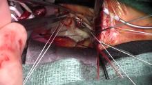 First, Dr. Gaudiani cannulated the femoral vein, then performed an upper ministernotomy before placing a right superior pulmonary vein vent and aortic cannulation with antegrade cardioplegia. The roof of the left atrium was then opened, and stay sutures were placed to optimize the view.